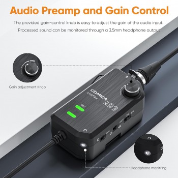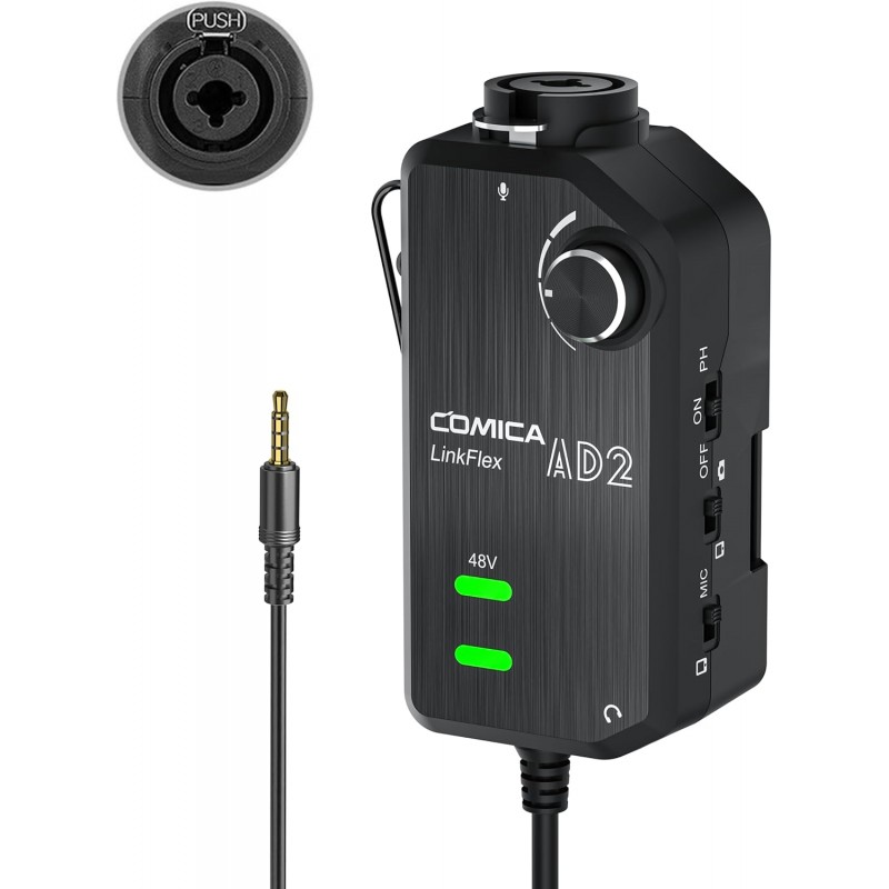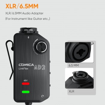 - Entrada de audio XLR/0.250 in: Linkflex AD2 es compatible con conector de audio XLR/0.250 in (para instrumentos). Es una manera fácil de conectar micrófonos profesionales para iPhone, Android, cámara Nikon Canon y guitarra, etc.