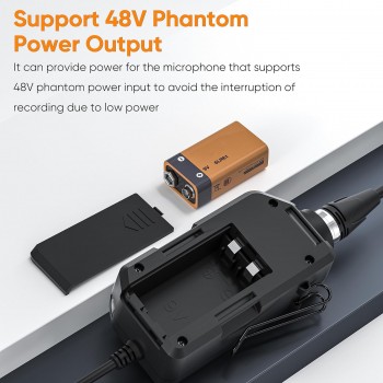 - Salida de potencia fantasma de 48 V: con la potencia fantasma de 48 V (proporcionada por una batería de 9 V), el adaptador de preamplificador AD2 de LINKFLEX soporta cualquier micrófono de condensador XLR.